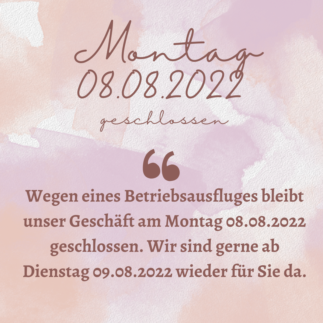 4. August 20224. August 2022Montag 08.08.2022 geschlossen Wegen eines Betriebsausfluges bleibt unser Geschäft am Montag 08.08.2022 geschlossen. Wir sind gerne ab Dienstag 09.08.2022 wieder für Sie da.
